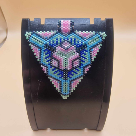 Ce pendentif triangulaire en perles Miyuki vous transporte dans un univers onirique. Les couleurs douces et pastel, telles que le rose et le vert d'eau, évoquent la nature et la sérénité. Le motif, inspiré de l'œil de la providence, symbolise la protection et l'éternité. Un bijou unique et porteur de sens, parfait pour les esprits libres.
