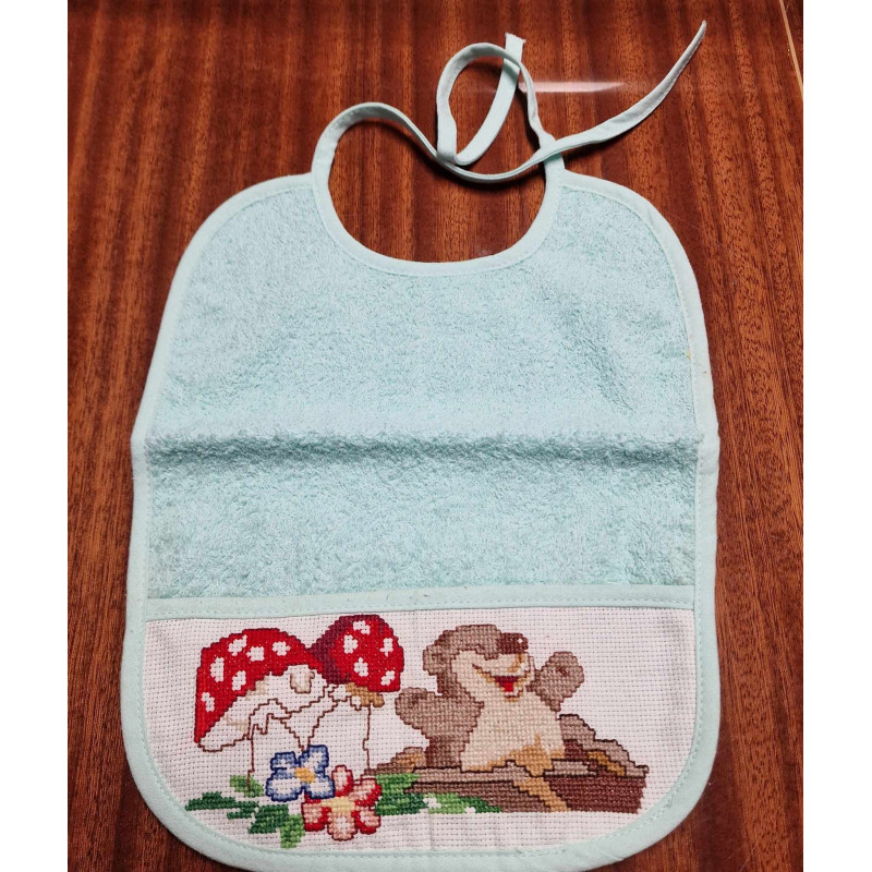 Bavoir en tissu éponge, avec poche et motif brodé de taupe avec un champignon. Confortable et pratique pour les tout-petits.